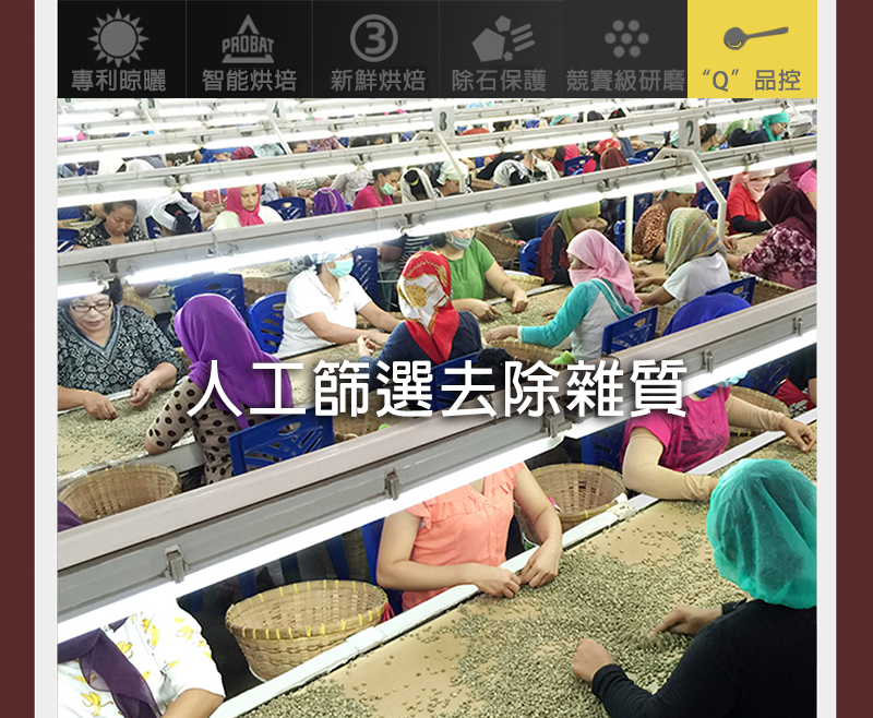經由人工挑選優質生豆,剔除瑕疵生豆(發霉或發酸生豆蟲蛀破碎生長不全)