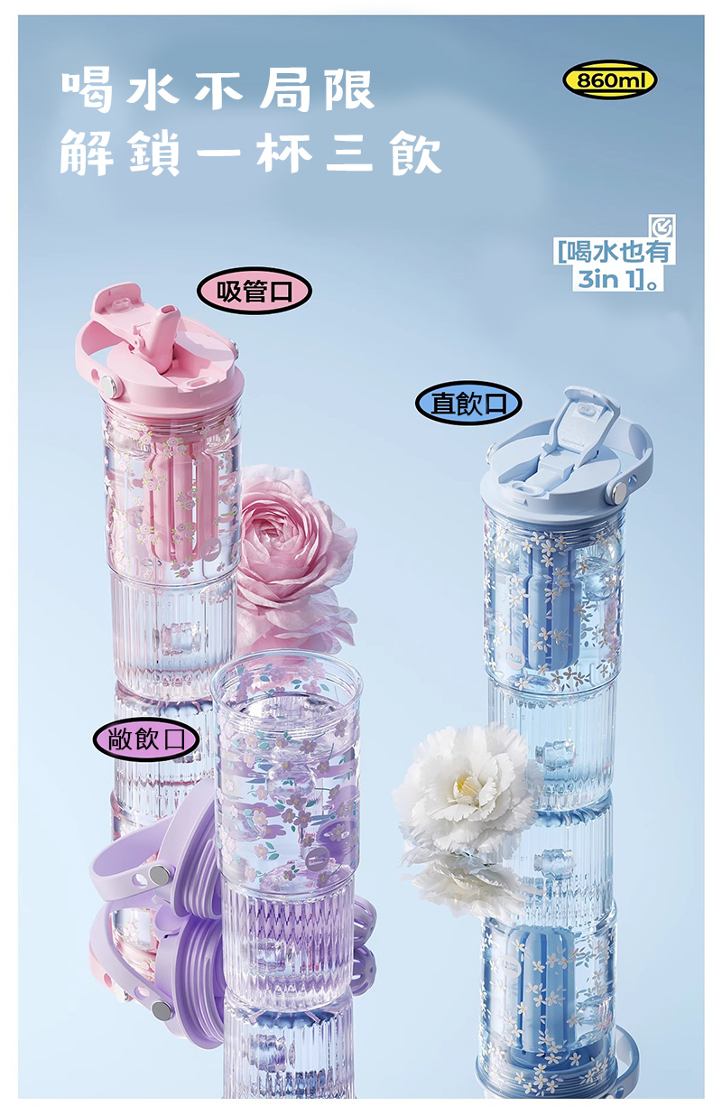 三種飲水方式 – 吸管式、啜飲式、直飲式,隨心切換,滿足不同飲水需求。