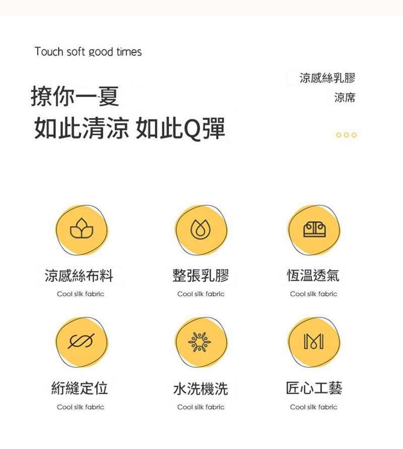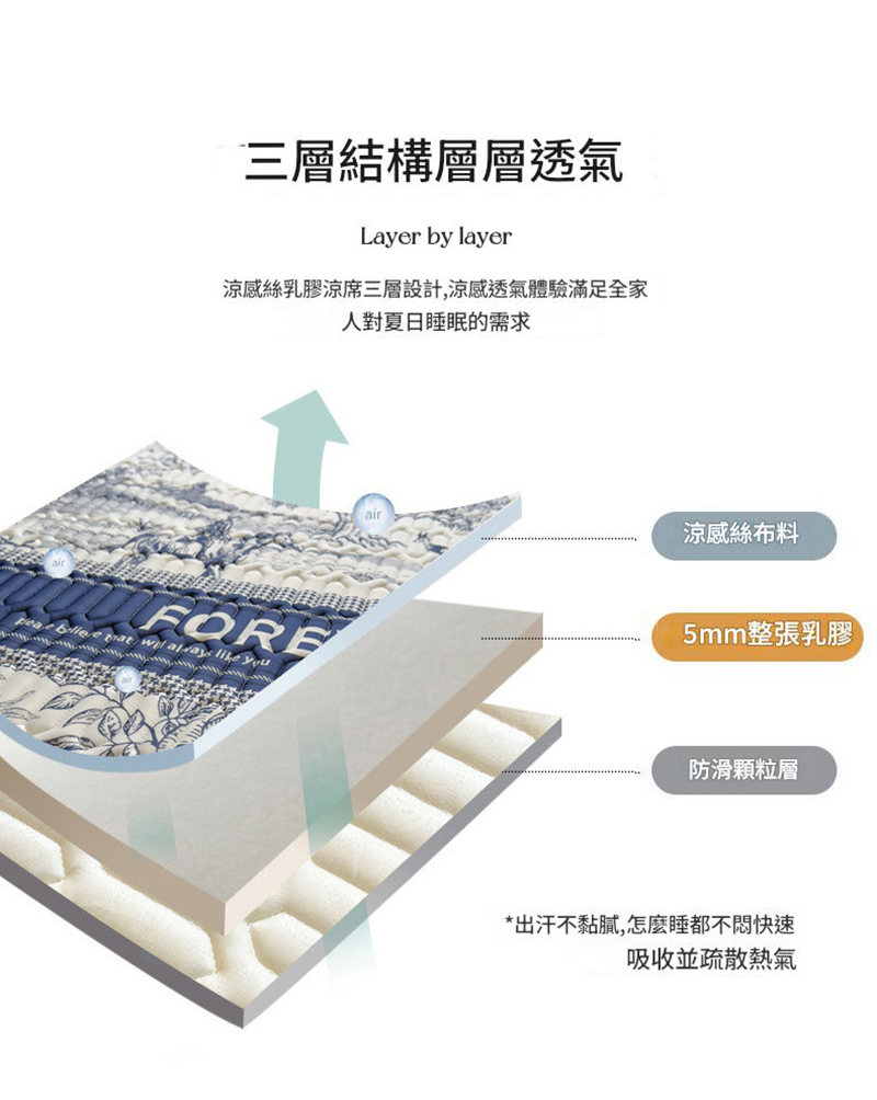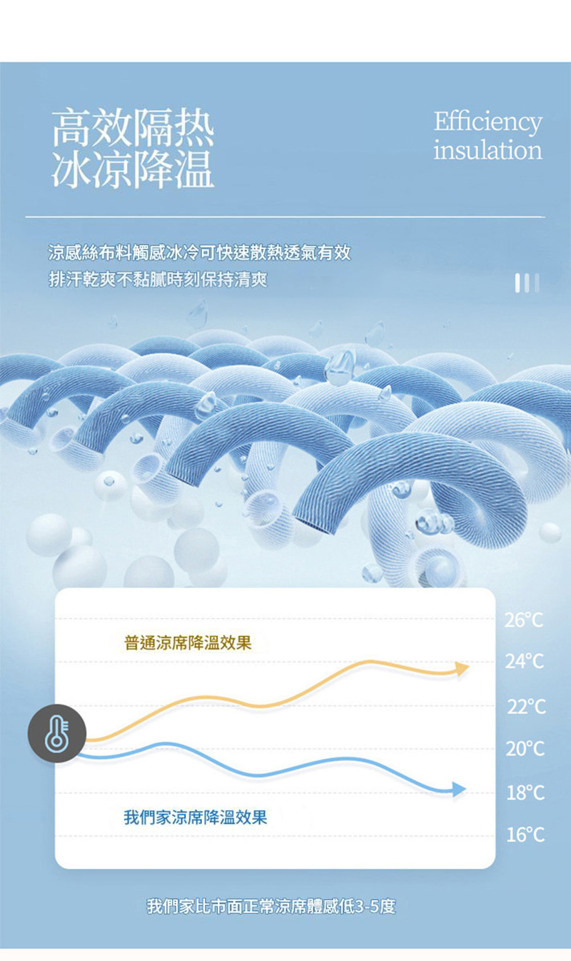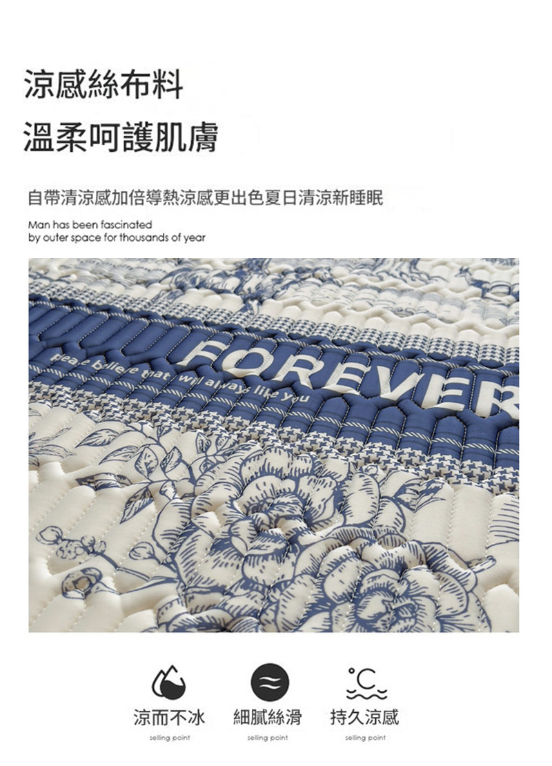 涼感冰絲表布:冰絲材質觸感柔滑,具備良好的透氣性與吸濕性,能迅速降低皮膚表面溫度,帶來即時的涼爽感受。