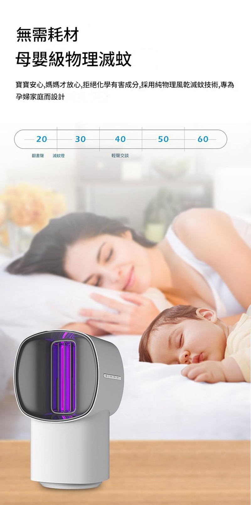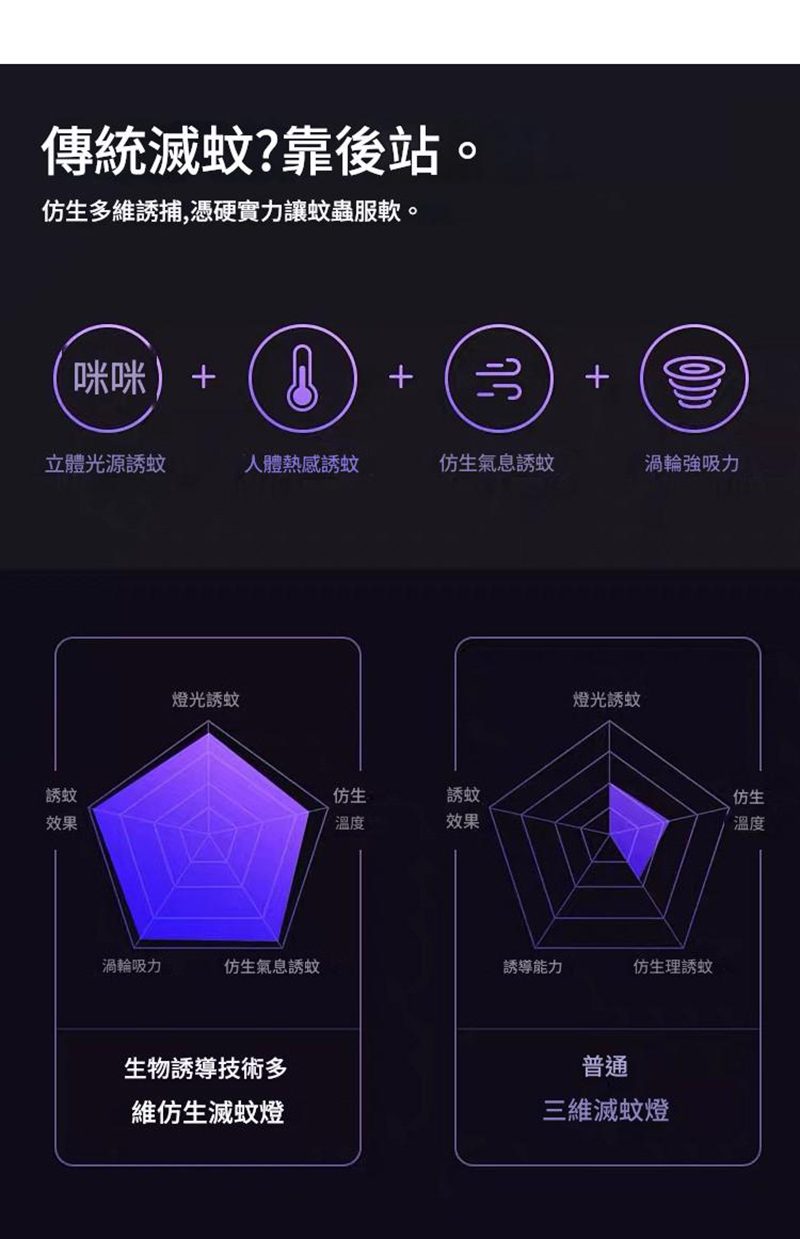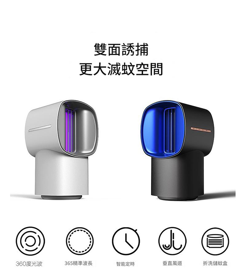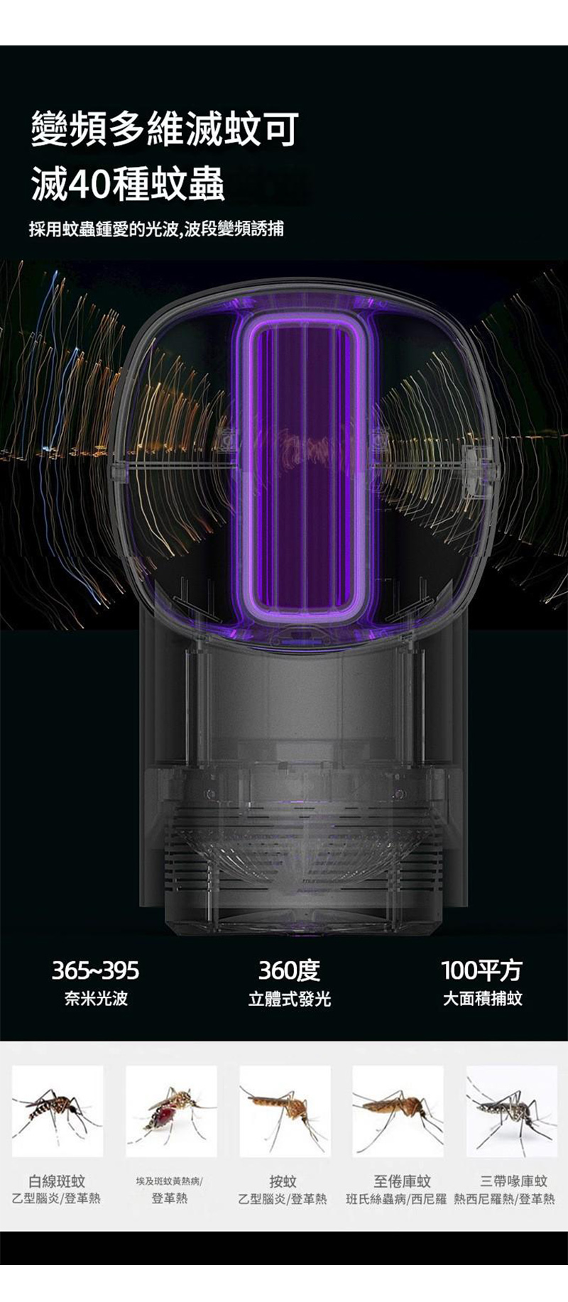 360度光源誘蚊:360度全方位光源 產生365~395納米光波誘蚊 吸引蚊蟲靠近,提高捕蚊效率。