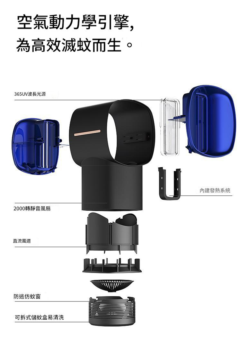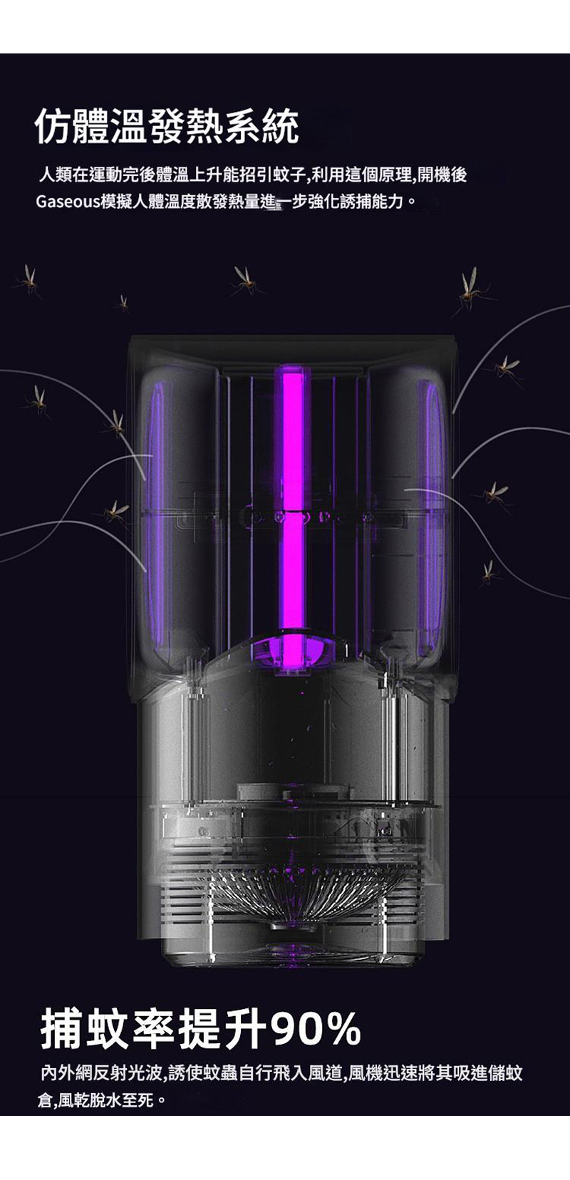 垂直風道吸入式滅蚊:設計垂直風道,形成強勁氣流,將蚊蟲吸入並集中處理。