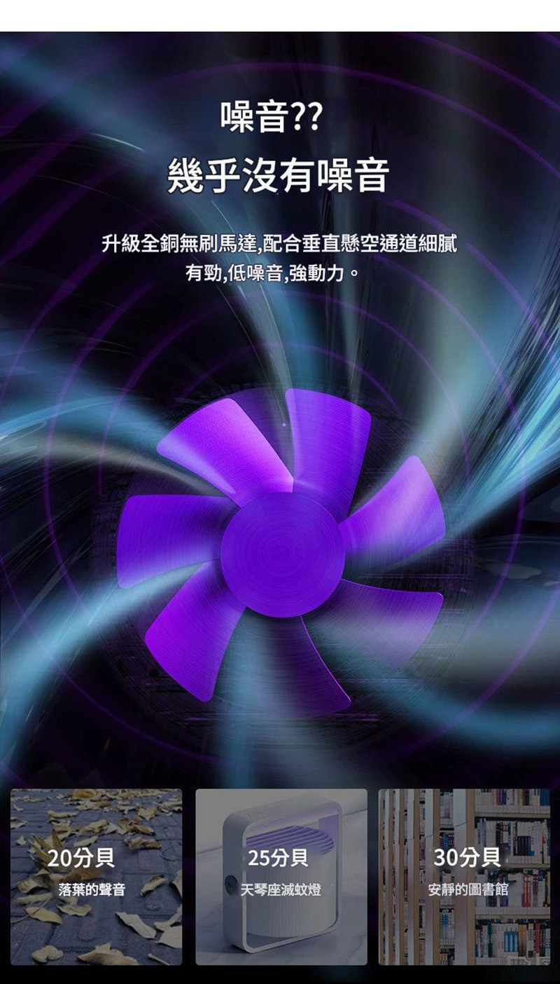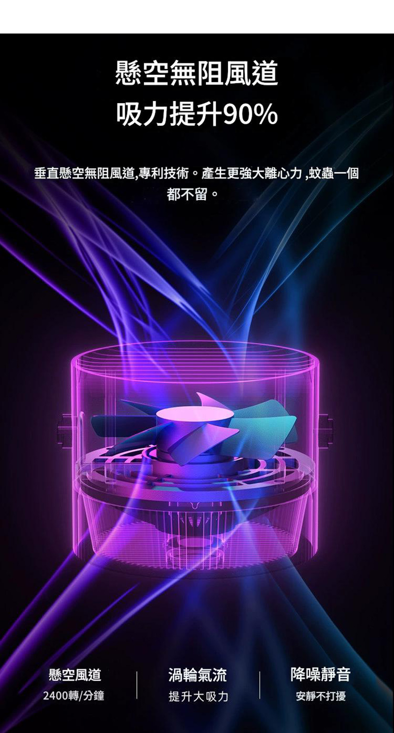 垂直風道吸入式滅蚊:設計垂直風道,形成強勁氣流,將蚊蟲吸入並集中處理。