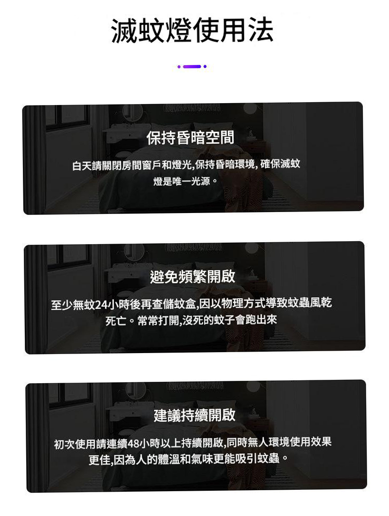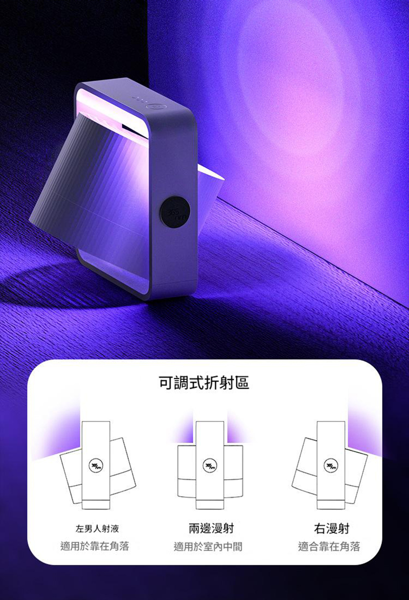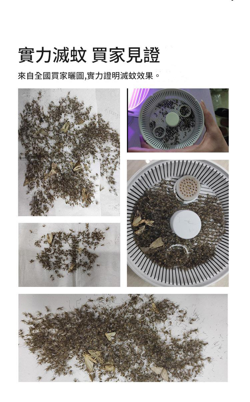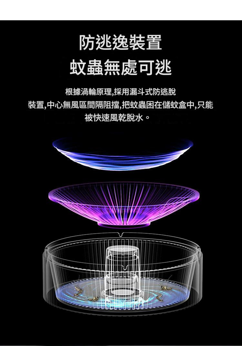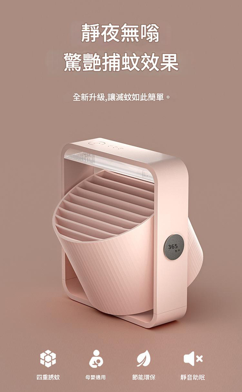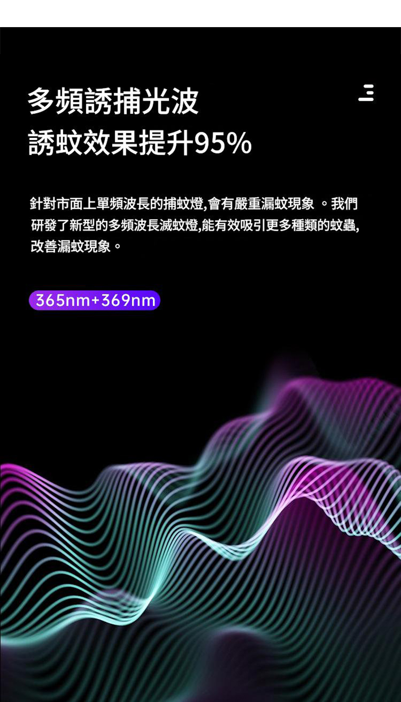 360度光源誘蚊:360度全方位光源 產生365~395納米光波誘蚊 吸引蚊蟲靠近,提高捕蚊效率。