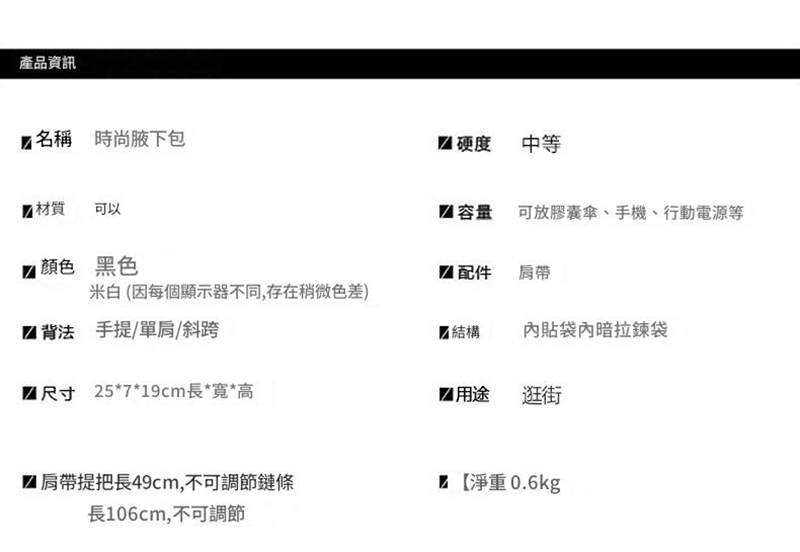 尺寸—下長27X寬7X高19cm 提把長49cm 不可調,鏈條長106cm 不可調