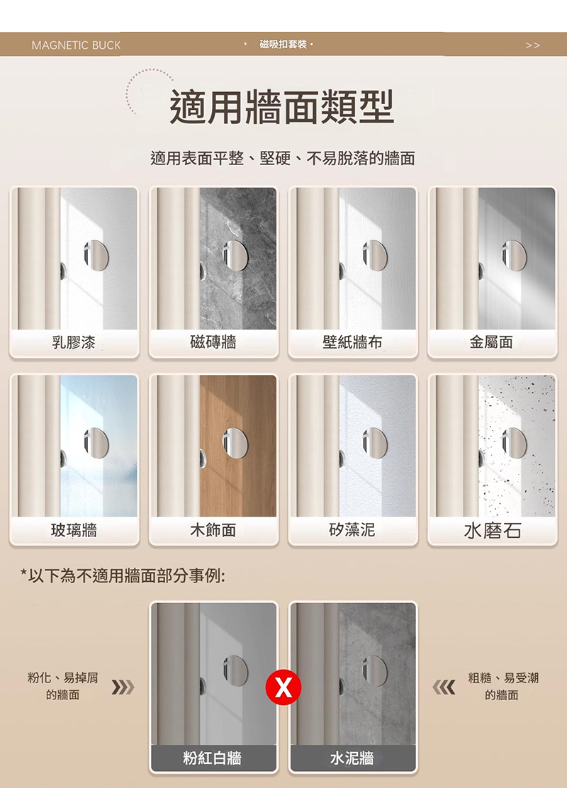 多種牆面適用:適用於光滑、堅硬的牆面材質。