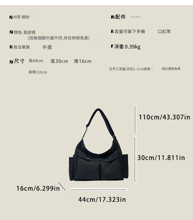 適中容量: 尺寸設計足以容納日常手機、錢包、化妝品等基本隨身物品。