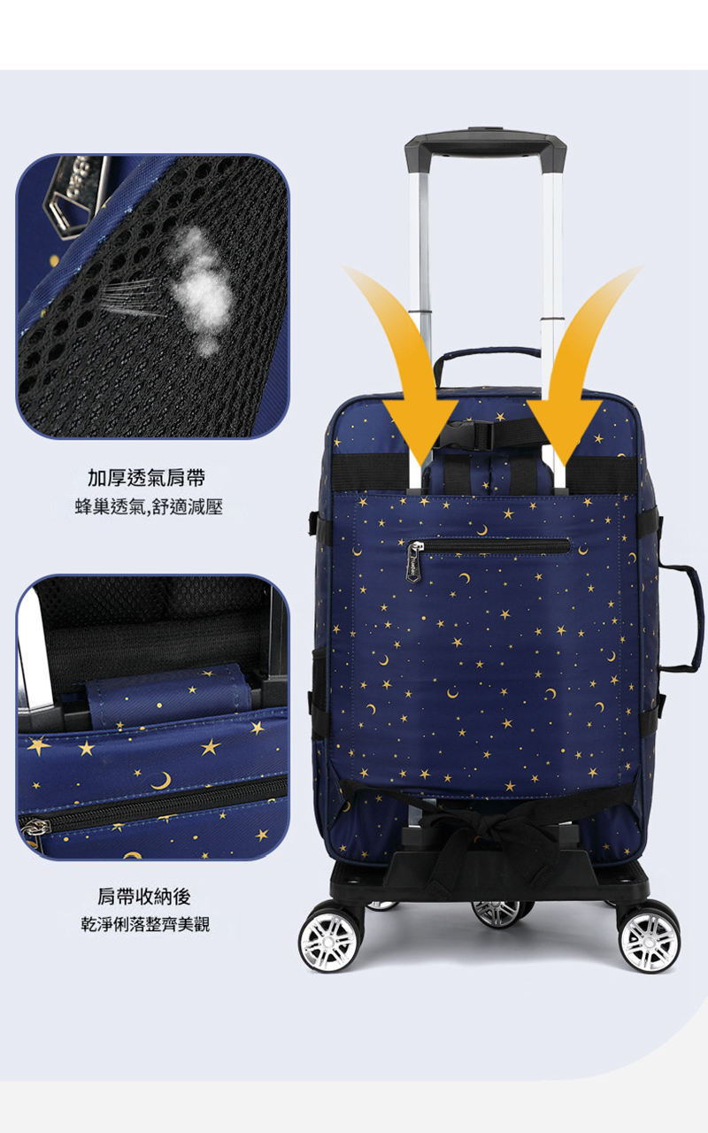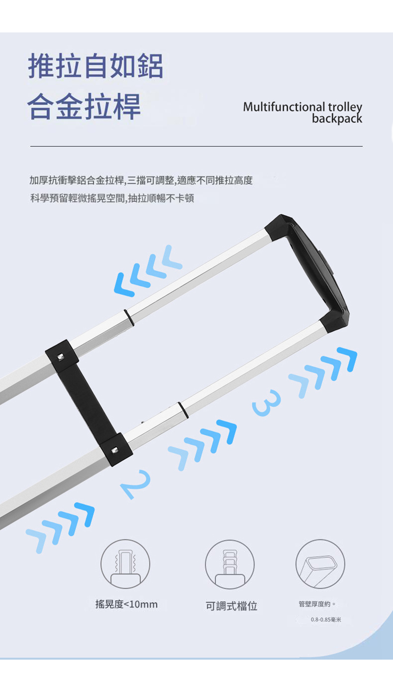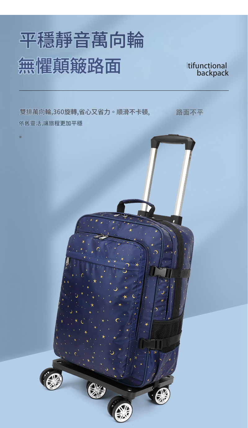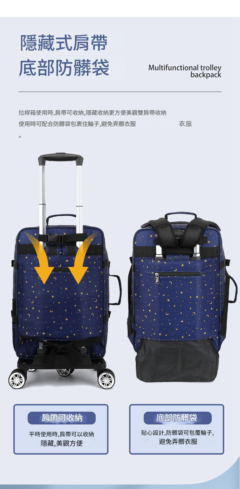 多功能背負: 除了拉桿拖行,也配有雙肩背帶,可轉換為後背包使用。
