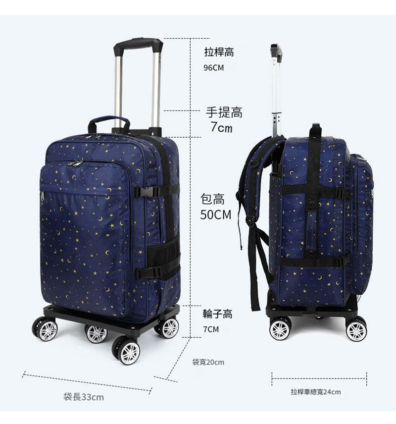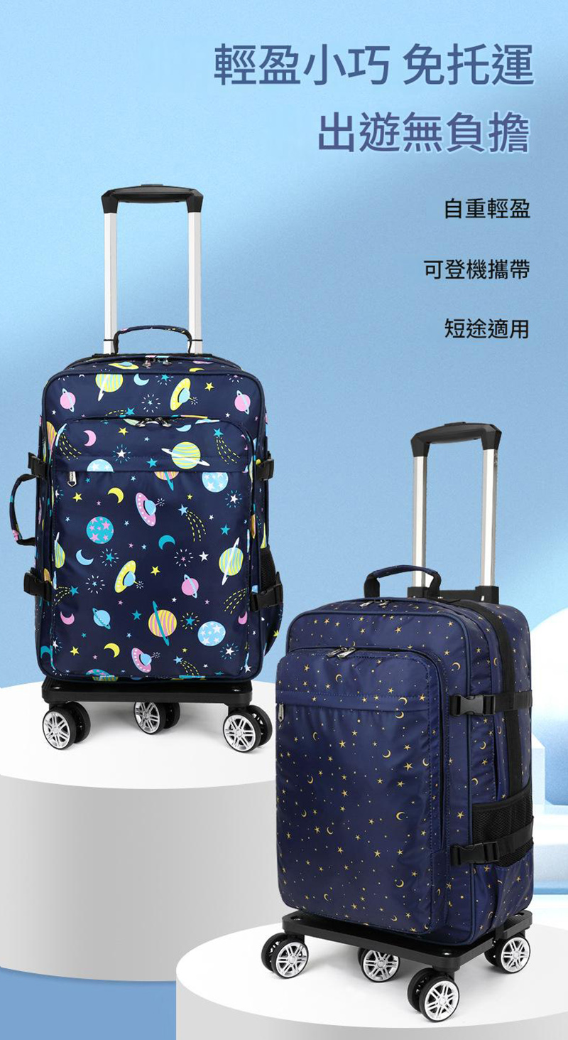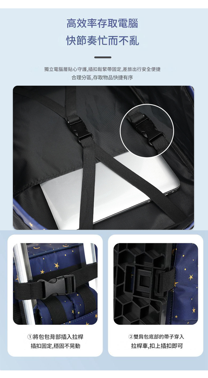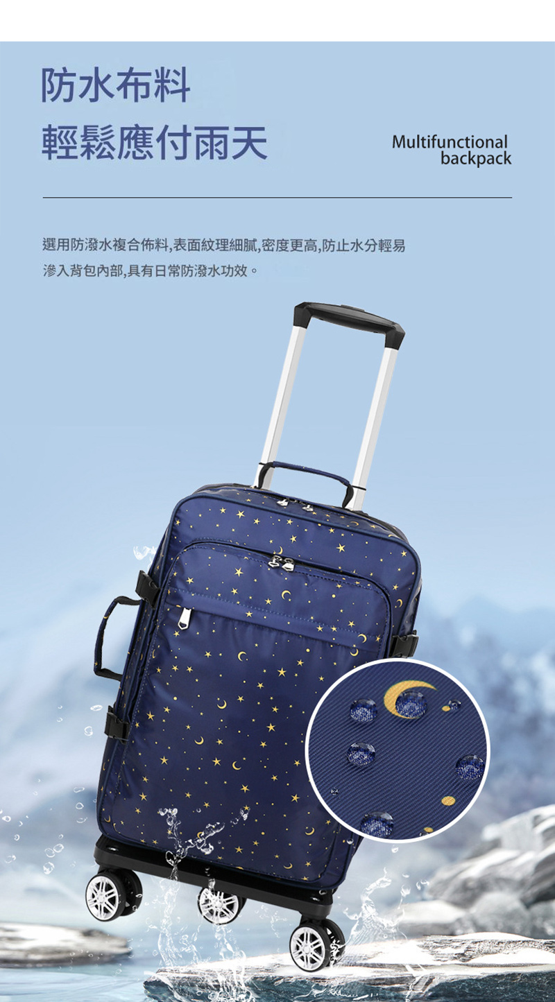 多功能背負: 除了拉桿拖行,也配有雙肩背帶,可轉換為後背包使用。