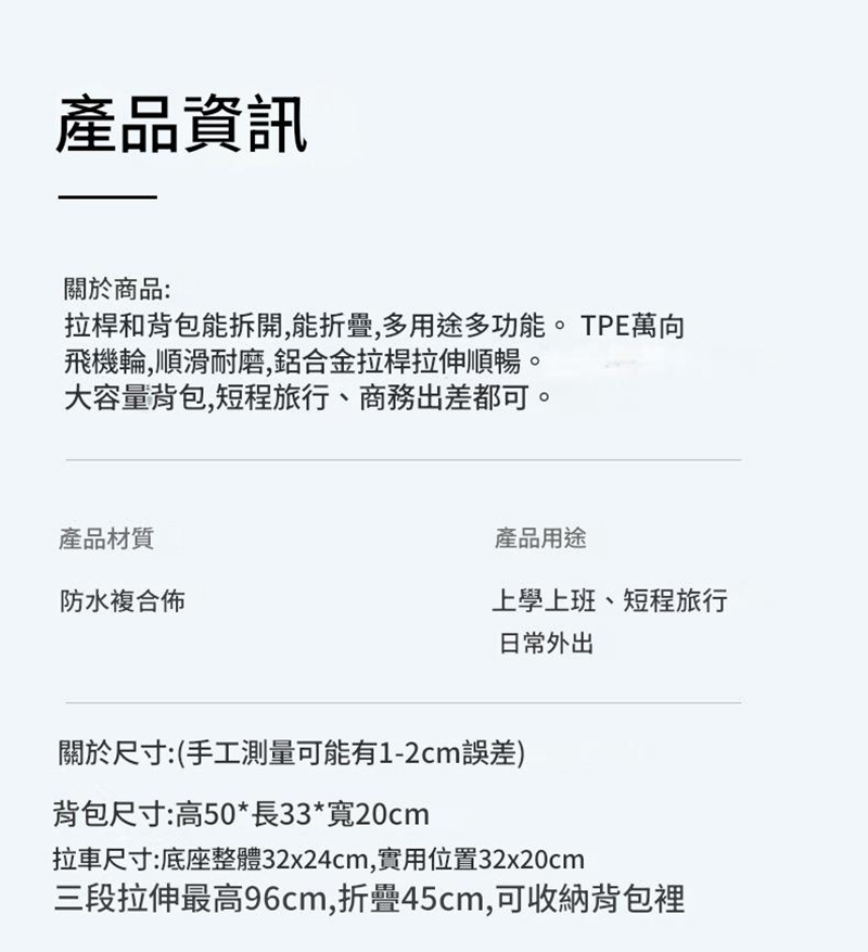 ※ 因測量方式不同,若有1~2cm誤差皆屬合理範圍。※ 拉桿間隙設計有輕微晃動感,是為了在冷熱天氣不同,熱漲冷縮時依然能將拉桿順暢拉出。