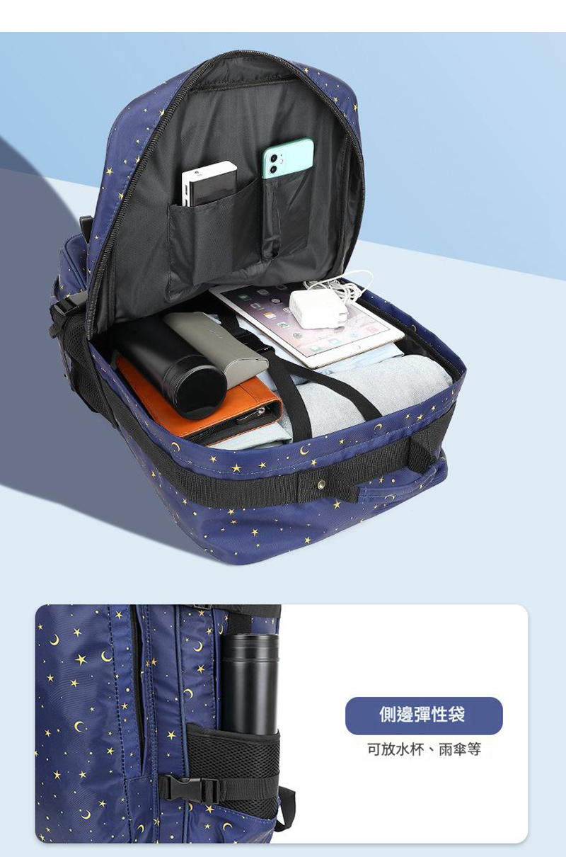 多個收納口袋: 設有前袋及側袋,便於分類收納小物、水壺等。