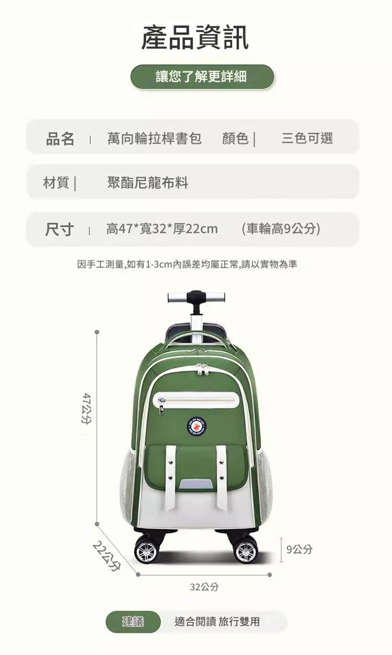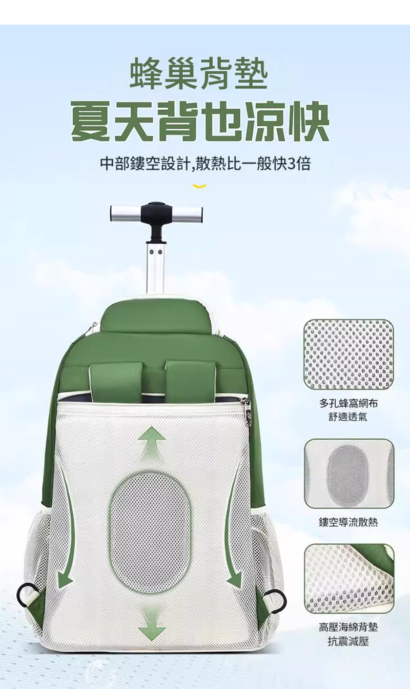 ▲商品介紹可伸縮拉桿設計: 內建隱藏式拉桿,方便學童拖行,減輕書本重擔。