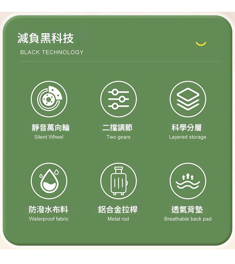 航空級拉桿,橡膠萬向輪:配備航空級材質拉桿,承重力強,搭配橡膠萬向輪,順暢靜音,推拉更省力。