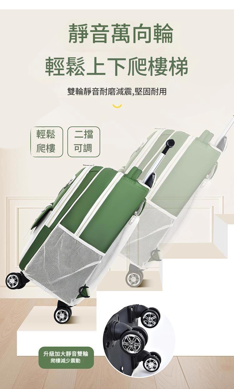 靜音耐磨滑輪: 底部配備滑順耐用的滾輪,拖行時噪音小,適應多種路面。