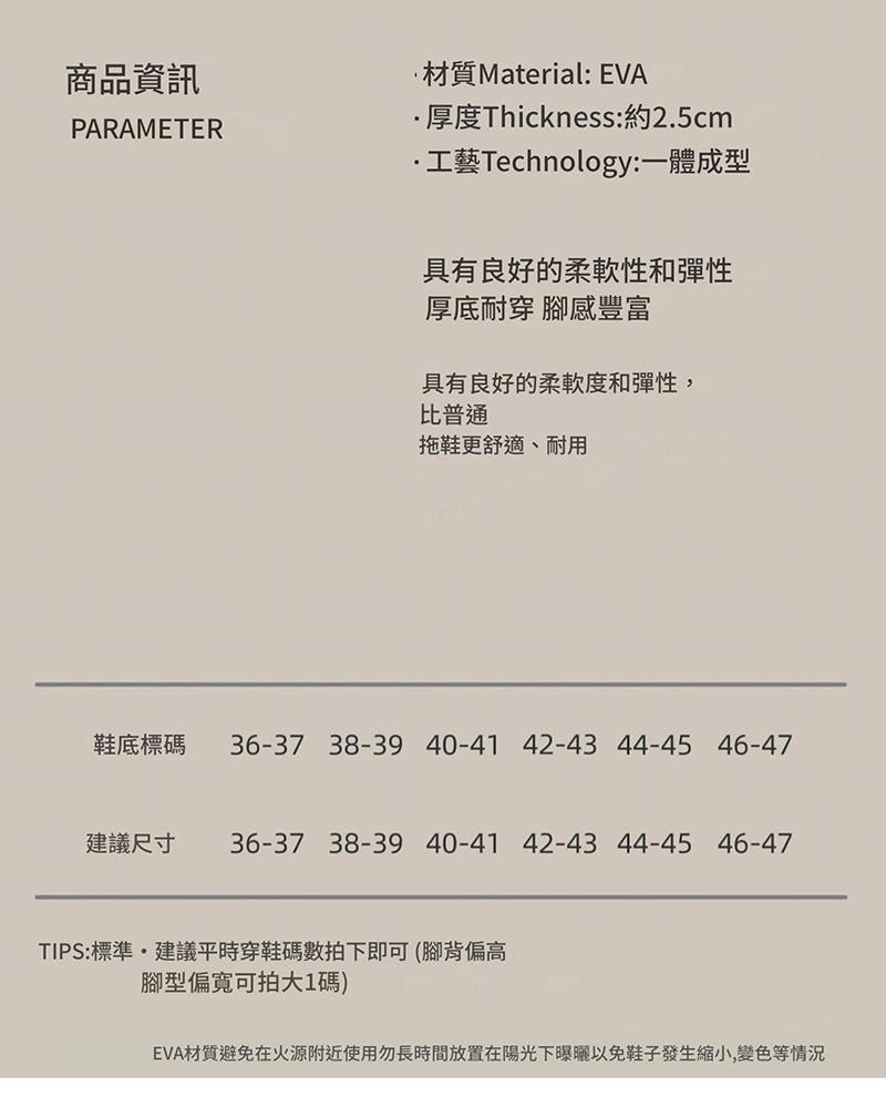 採用 EVA 材質一體成型,具有良好的柔軟度和彈性,穿著舒適。