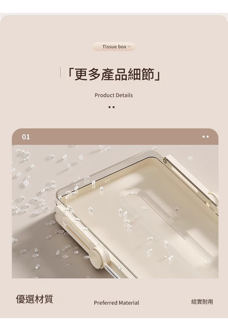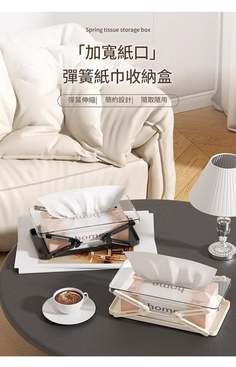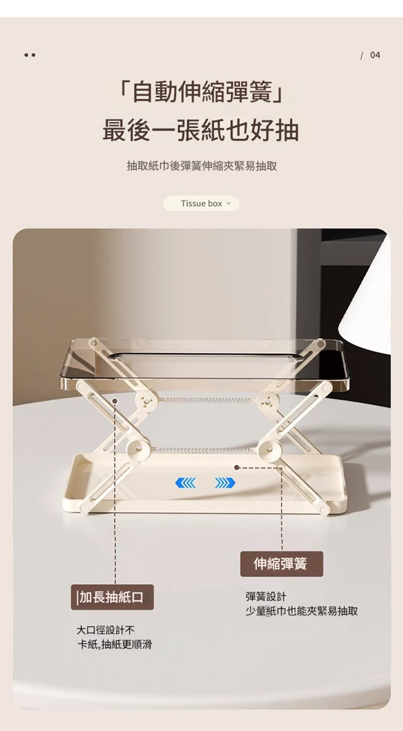 專利彈簧自動升降設計: 內建彈力托板,使衛生紙始終保持在盒口高度。
