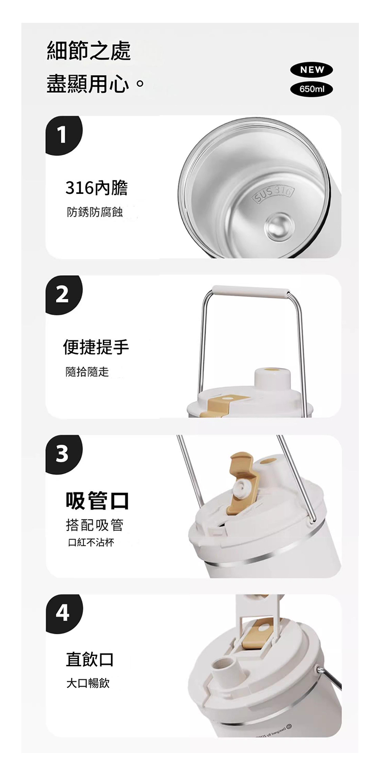 食品級 316 不鏽鋼,防鏽防腐蝕。 內膽安全升級,牛奶咖啡隨心裝。