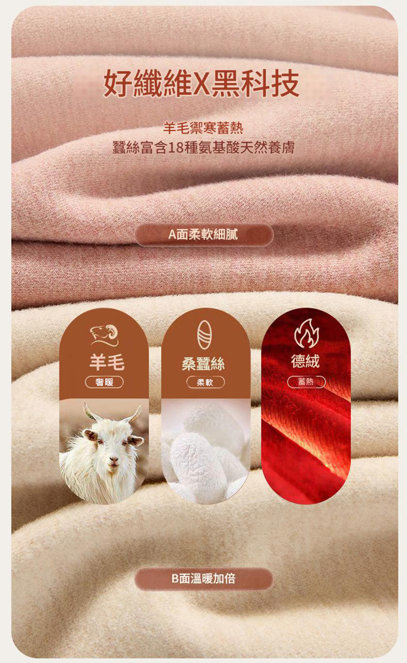 羊毛禦寒蓄熱: 羊毛與德絨具備柔滑抗寒與超細發熱特性。