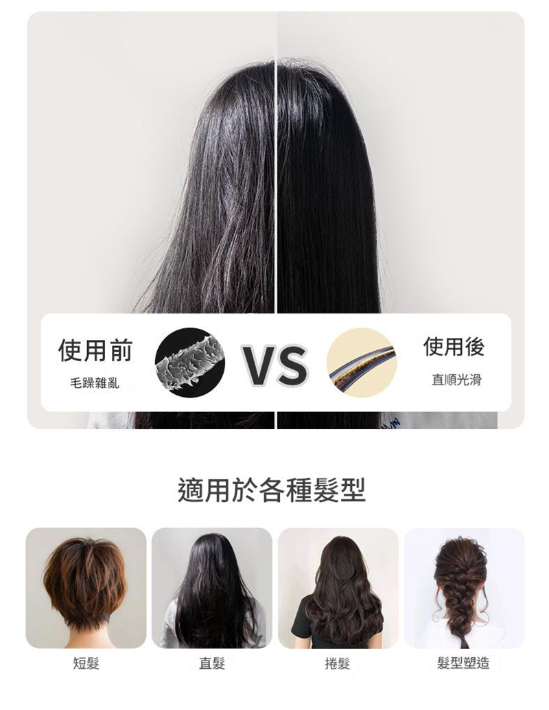改善毛躁糾結:瞬效柔順髮絲,各種髮型皆適用。