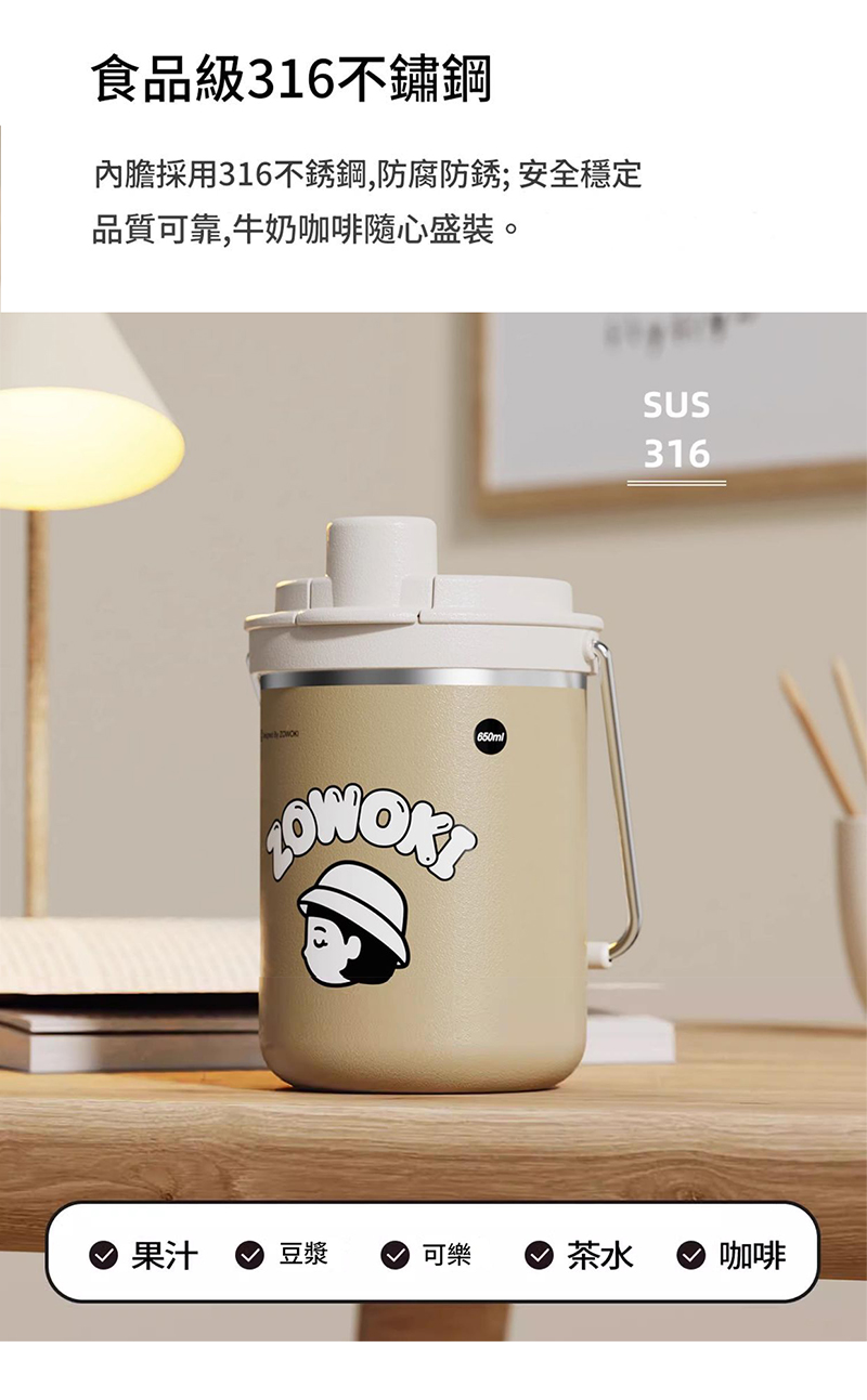 食品級 316 不鏽鋼,防鏽防腐蝕。 內膽安全升級,牛奶咖啡隨心裝。