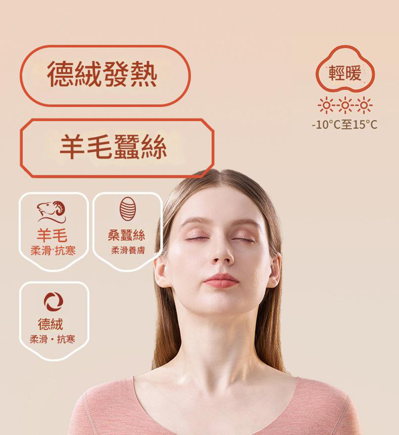 羊毛禦寒蓄熱: 羊毛與德絨具備柔滑抗寒與超細發熱特性。