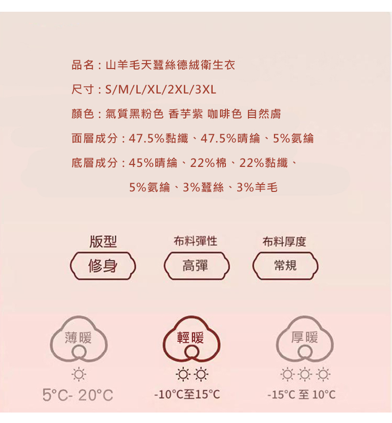 內裡成分--3%蠶絲 3%羊毛 5%氨綸 22%棉 22%黏纖 45%腈綸