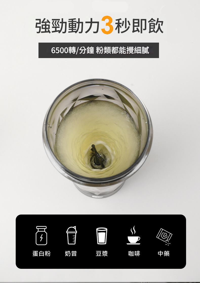 高轉速馬達: 6500轉電動攪拌杯,粉末細緻不結塊。