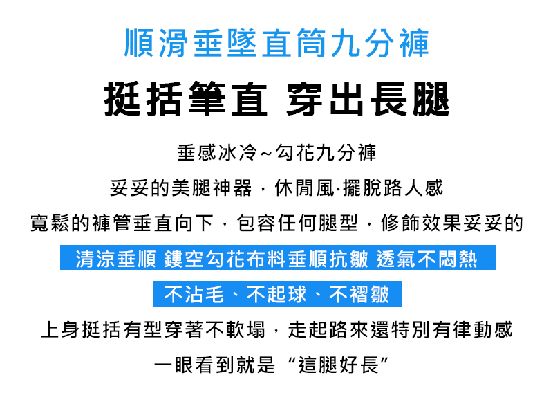 顯瘦九分褲:立體裁剪直筒版型,完美修飾假跨寬。